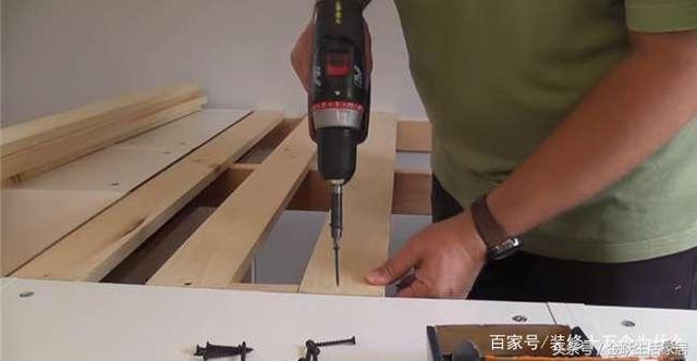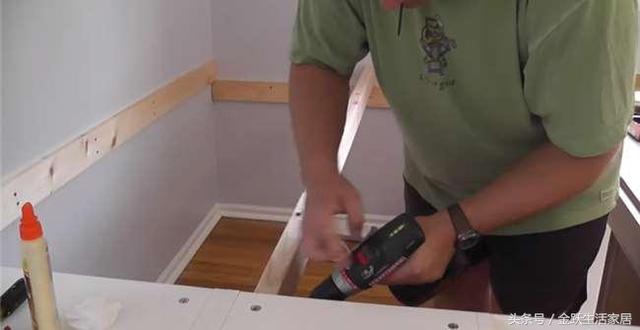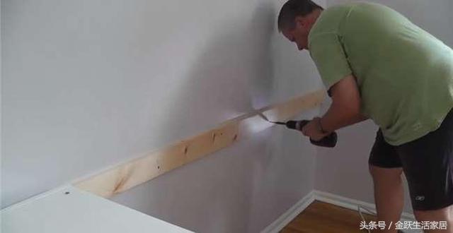 柜子固定好之后,就可以动手来做撑住床板的部分了!在墙面钉上用来木头的边条。