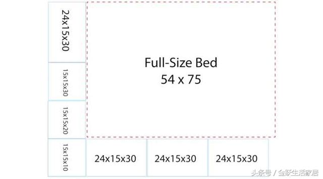 红色虚线是要放上床垫的地方,而蓝色则是床旁边的柜子。