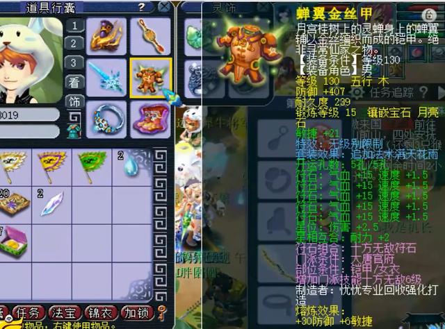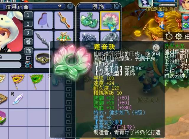 后排灵饰装备看起来很普通,但附加了属性很完美,两件都是100级装备,附加的都是双防御与一气血属性,点化了8级健步如飞特效,打满了10级星辉石宝石。