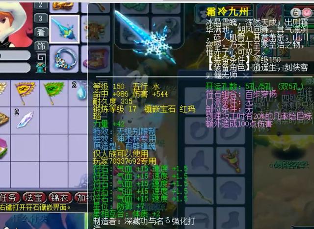 武器是这个109级大唐官府的重点,配置了一把150级高伤无级别剑,单加力量42,锻炼了17段红玛瑙,武器总伤害超过了900,就这把武器,随便拿出去就可以换一套房子。