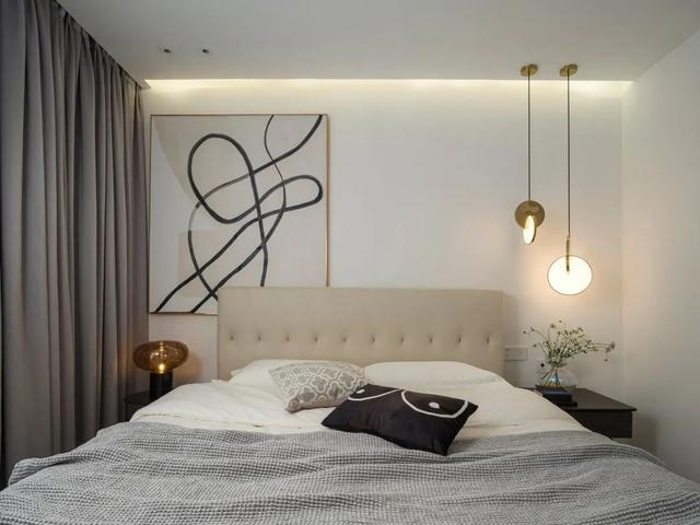 主卧色调清新,简约的吊灯有金属元素,质感满满,床头背景墙抽象挂画成为空间的点睛之笔。