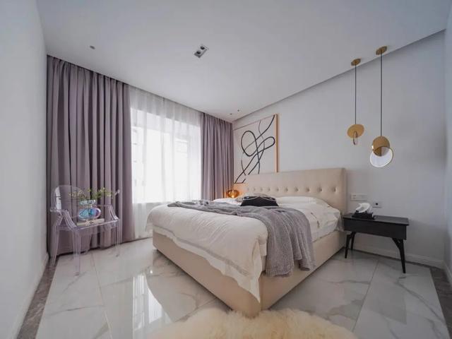 The master bedroom is fresh in color, and the simple chandelier is full of metal elements
