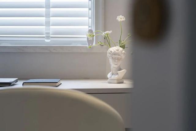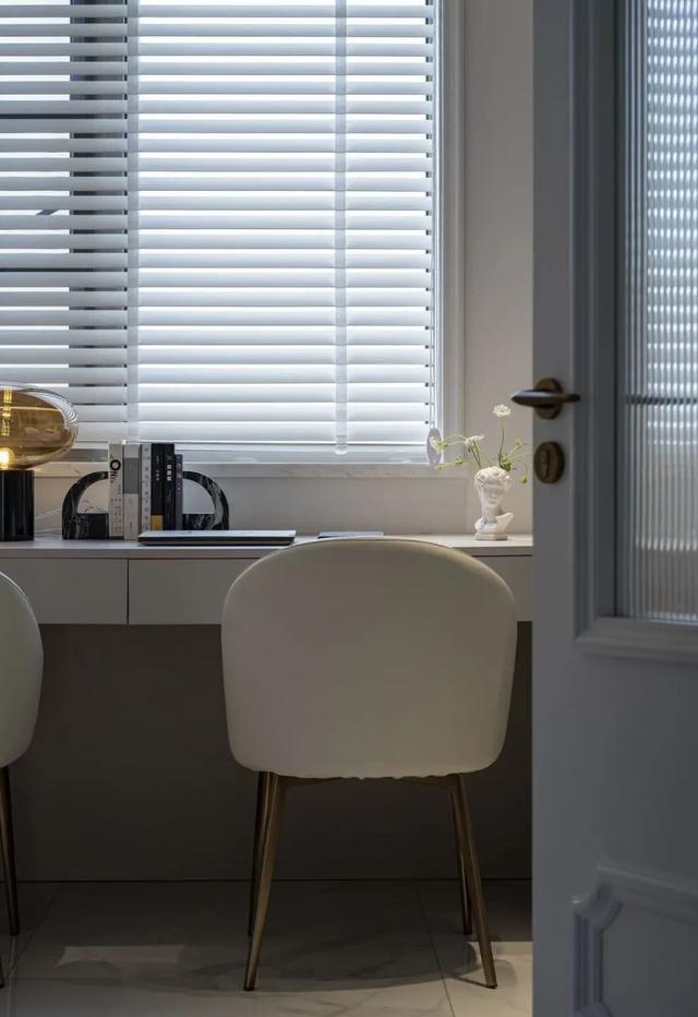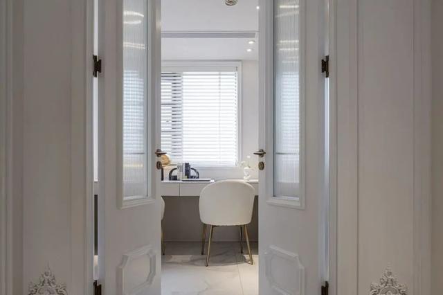 客厅推门进入书房引入自然光线,抛弃复杂纹理,保留古典曲线与曲面,书房上的装饰摆件增加艺术氛围,细节处饱含工艺精华,