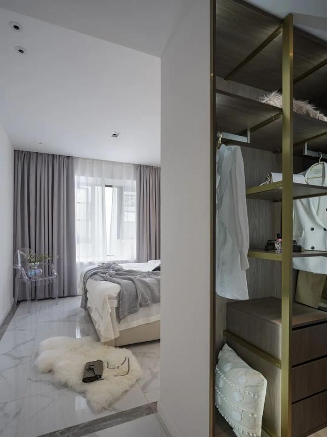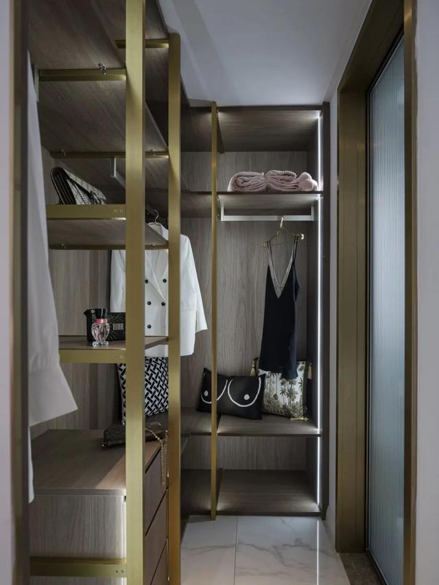 步入开放式衣帽间原木与金属元素延伸到柜子和隔板,整体没有过多的装饰,却很显得高级。