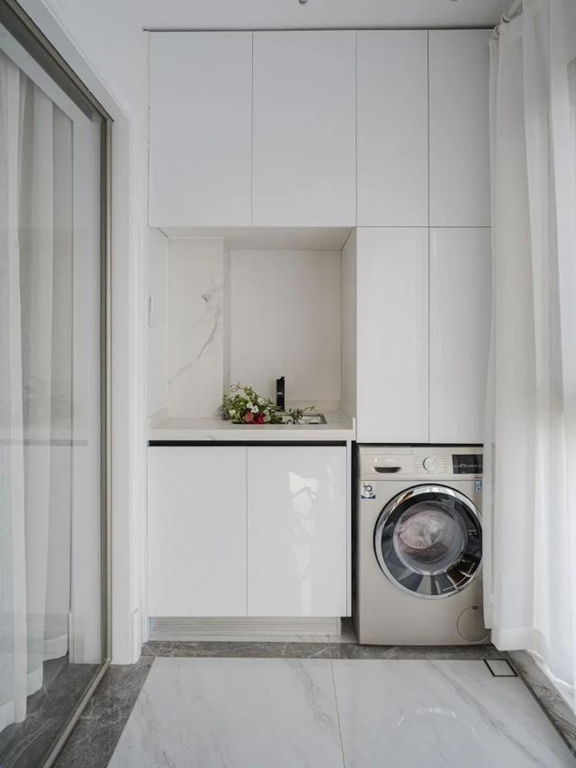 阳台的一侧做上洗衣机、收纳柜和吊柜的组合式设计,非常实用。