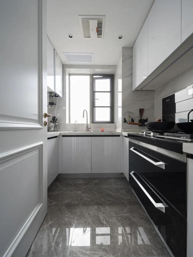 U型厨房设计,侧面迎窗,光线充足。所有的橱柜与客餐厅风格一致,每一扇柜门都以线条刻画出美感。白色和灰色的大理石材质,更是将经典、简约进行到底。