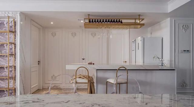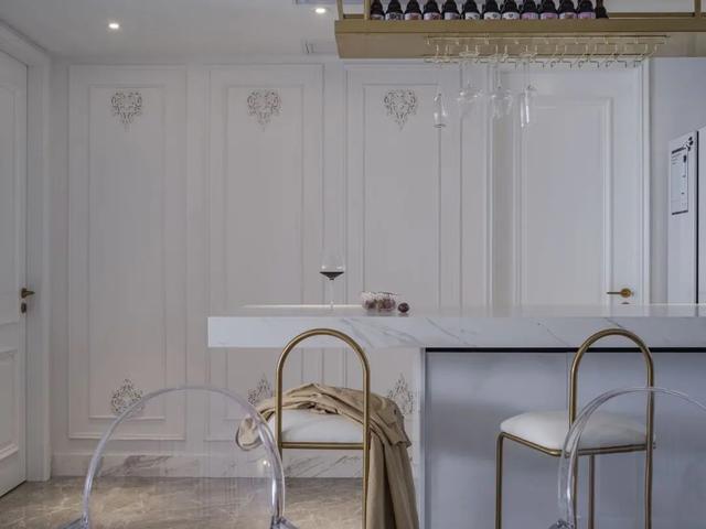 餐桌对面的吧台增加操作台面,通过优雅的大理石质感,装扮出一个高档大方的空间感,偶尔与朋友小酌也是氛围感极佳。