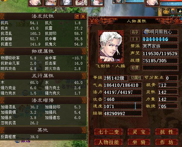 2转142级男人,712的根骨705的敏捷,18.6万血1071的敏,非常不错了。3抗仙法,抗混160,抗遗忘141,强混30,忽视混26.2,在这个等级非常无敌了。