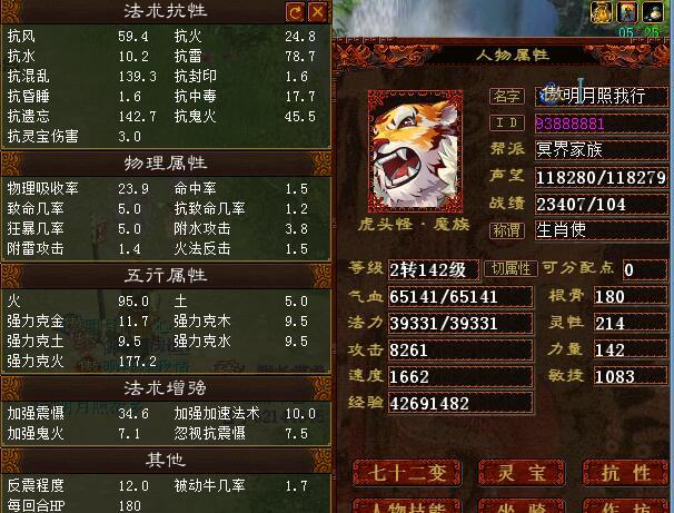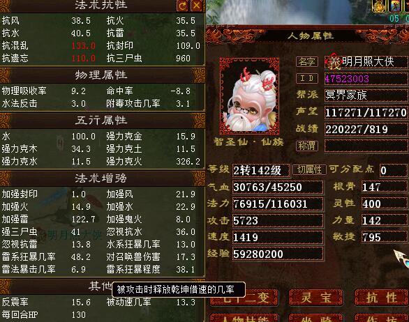 2转142级老头仙,400灵性其他全敏加点,4.5万血11.6万法1419的敏,抗性方面冰混遗忘3抗,强雷122忽视雷13.8,雷狂暴48,克火326,这个输出是相当给力的。