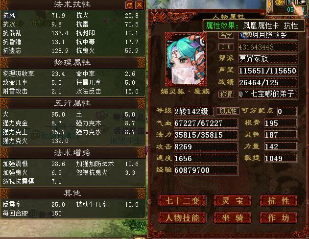2转142级女魔,全敏加点,6.7万血,3.5万法,1656的速度。抗风72抗雷70抗混133,抗遗忘129,抗鬼火60,整体抗性非常不错了。克火139强抽28.6忽视抽7.1,任务的话应该是非常给力的。