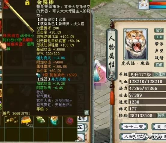 飞升177级老虎头男魔。气血12.8万,攻击力9万7,速度1230。武器是5级破物理神兵,打了一个7级宝石附加攻击5320,炼器加成攻击19.2。蓝字是强力克火13,不过由于玩家是神兵无属性玩法,强克数值没作用。