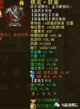 衣服也是铁衣传世套装,炼化出力量加19,加成攻击17。底子是加防御11020,大力的衣服对防御数值的要求比较高。狂暴的时候防御可以转换成攻击力相当的可观。