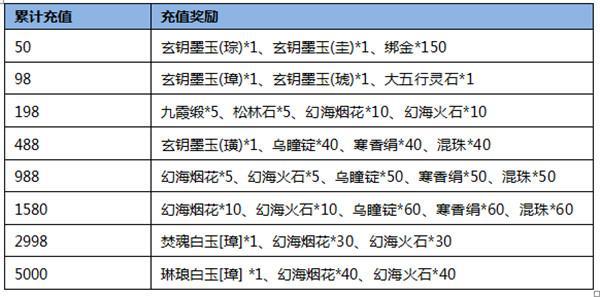 每日累冲1000元:大五行灵石*10、幻海烟花*30、幻海火石*30、龙牙青玉*1*、淬炼锤*50