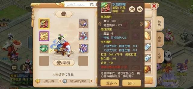 这位月宫的头盔是13段100级忽视物防2%的头盔,115级号的物防都不低,忽视物防2%相当于变相提升自己的物伤吧。再搭配上两颗13级太阳石,这物伤加成简直恐怖。