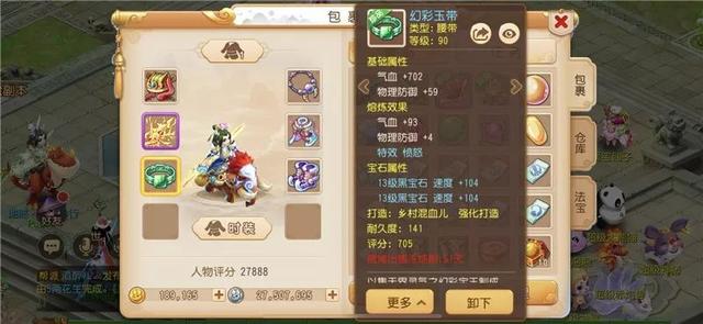 号上的腰带是件13段90级愤怒腰带,腰带的基础气血795,物防63,在90级腰带里算是不错的了。腰带上的宝石选择了黑宝石来增加人物的速度属性。愤怒特效是PK爱好者必备的特效,懂的少侠自然懂。