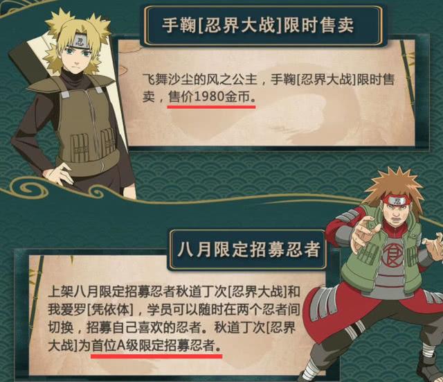 忍界大战忍者目前已经出了好几位,但以往都是以限定招募和点券购买的形式上架。而这一次与以往有很大的不同,因为忍战手鞠是以金币售卖的方式上架,而且只要1980金币就能招募!这不等于是白送么?虽然说这对广大玩家来说是一个好消息,但是我风之国砂隐村的公主就这么没排面儿吗?(滑稽)而另一位则更加特殊,他就是忍战丁次!目前所有的限定招募都是B级忍者,而忍战丁次却是以A忍的身份上架,可以说是非常有面子了!但是身份提升了,价格自然也要涨,所以小编猜测想要招募忍战丁次,恐怕需要16张限定卷!