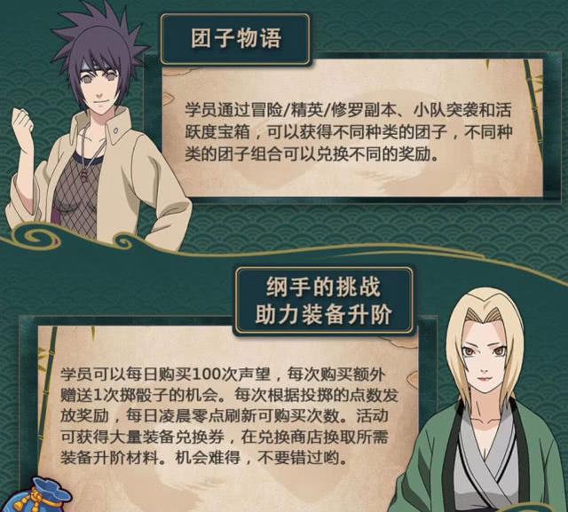 最后是团子物语和新版纲手的挑战。团子物语没什么好说的,咱们重点来聊聊改版后的瓢纲手活动!之前这个活动都是用铜币去买装备材料,同时还能获得一些其它材料来提升战力,但对于声望溢出的玩家来说,这个活动没什么意义。但伴随着通灵兽进阶的活动上线,小编存下来的300多万声望眼看着就要烧光了,这样下去铜币就会越来越多,变成没有用的资源!而魔方这次的改动就是为了防止这样的事情发生,让玩家可以通过纲手挑战这一活动去消耗铜币兑换声望,让两种资源达到平衡的状态!小伙伴们,你们最期待的是哪一个活动呢?