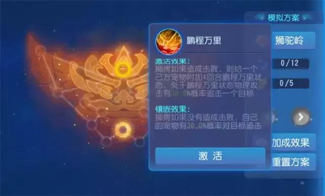 鹏程万里经脉调整后,对狮驼攻宠的输出能力有了明显提升。鹏程万里激活效果调整为,狮搏如果造成击败,就会给一个己方宠物附加4回合鹏程万里状态,处于鹏程万里状态物理攻击有30%概率追击一个目标。也就是说,处于鹏程万里状态的攻宠,在这4回合将有不低的概率一次回合攻击2个目标,算上连击次数,一只宠物可在一回合攻击3次!