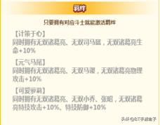 这些羁绊的要求通常是非常有趣的原著以及二次创作彩蛋,比如同时有吕布和貂蝉,那就会触发“恨相知晚”的羁绊,吕布生命值上限提升10%;无双诸葛亮和无双司马懿同时拥有则会触发“计策于心”,诸葛亮生命值提升10%。除此之外还有着双攻增加,增加防御的buff,这些属性对武将来说都是提升很明显的增益。