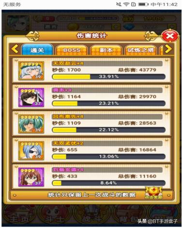十四、统计系统简介统计系统可能会被大家忽视,这个功能其实是非常有用的,可以让我们了解队伍里的武将伤害,在队伍里发挥的作用,让我们合理分配资源来培养武将,一个花大力气培养的武将要是伤害还不如简单培养的武将,那就要考虑更换培养策略了。