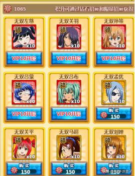 土豪喜闻乐见的商店,在用钻石抽武将时会同时获得的积分,在这里可以换各种武将碎片。如果你是VIP10,还可以换红色武将碎片,没错,有钱真的是可以为所欲为的。