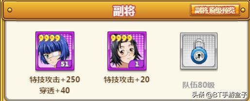 三个副将位置分别会在20级、50级、80级依次解锁,我们在放入副将时不用遵照系统推荐的来选,最好根据武将的伤害特性来放,太脆的可以放个加生命值和防御的副将,输出不够就放增加双攻、追击或者暴率的。选择很多样,不必拘泥于系统推荐。