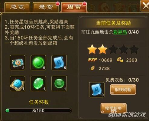 4.刷新任务星级需要消耗刷新卷/铜钱,VIP玩家享有逐级递增的免费刷新次数;