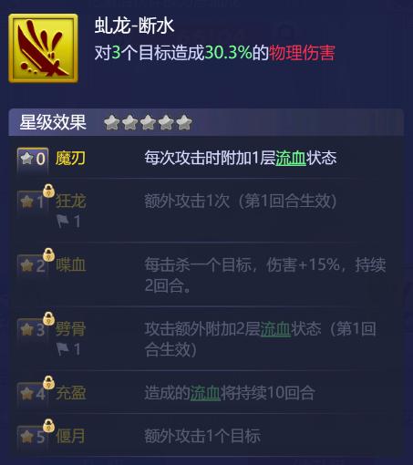 3星技能:劈骨,攻击额外附加2层流血状态(第1回合生效);