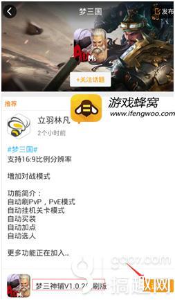2、注册蜂窝账号登录后,点击发现搜索梦三国手游,点击游戏话题梦三国手游。
