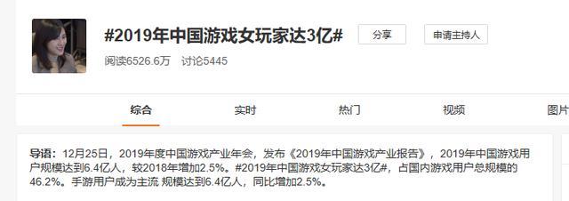 如果不计算老少皆宜的“消消乐”、“斗地主”等小游戏,《王者荣耀》这样的竞技手游可能是近年来女玩家们入坑游戏的最大功臣。根据不完全统计,大家日常匹配队友中,每5人就有1-2个女孩子;根据易观发布的《中国电子竞技用户综合分析2019》来看,2018年国内的电子竞技用户男女比例达到了6:4,2019年很可能已经五五开,所以我们看到知名女游戏主播越来越多,不仅火线妹、小团团等女电竞主播圈粉无数,连今年《炉石传说》全球冠军的荣誉也被一位中国妹子夺得。