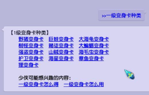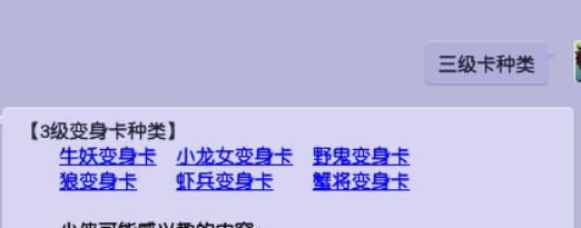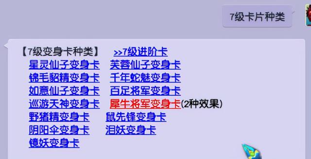 七级卡片中,百足将军卡片是最常见的了,在麒麟山封妖任务后续必给这个。变身后没有负面效果,因此很受欢迎,也有很多五开必做麒麟山封妖任务。其余种类的卡片获得途径较少,且用途也一般。