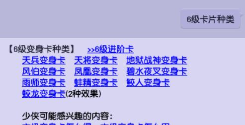 六级卡片中,蛟龙卡的感知效果,在门派闯关的时候最受欢迎。这是最容易获得的感知卡了,二级的狐狸精卡片产出太少。鲛人卡是在五更寒中很受欢迎,但是用途太单一。其余卡片的作用也不大。
