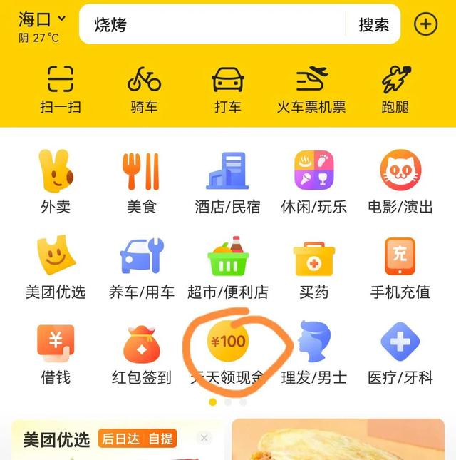 某团在首页推出“天天领现金”游戏,图标为100元,目前这款游戏,国内有几十万玩家,集娱乐与购物于一体化的游戏项目。