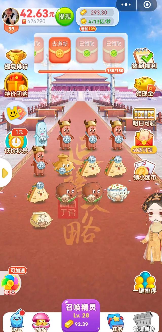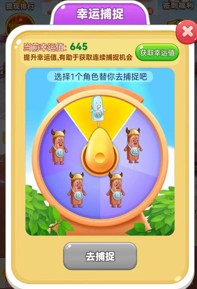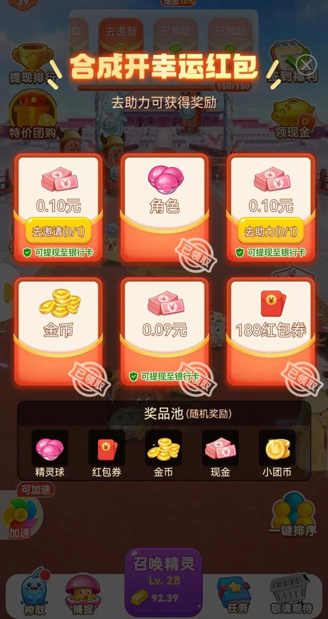 当你每天合成精灵达到一定次数,会获得幸运红包,这些红包分别是现金,邀请得现金,角色,金币,红包券。其中角色就是精灵,一般不多,我39级,每天这个渠道得不到一个“肉丸子”。