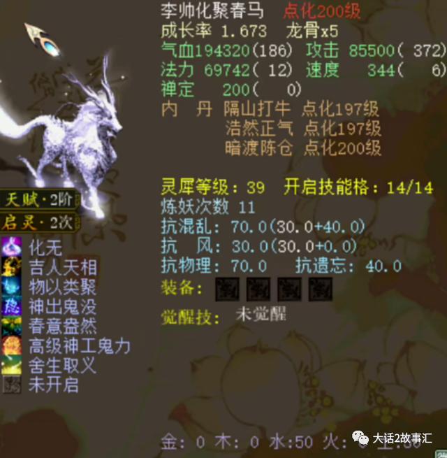 接下来是另一位土豪玩家养的三只化无龙马中的其中一只。技能非常的给力,攻击力8万多,血量将近20万,土豪的宝宝技能细节都让人如此着迷。