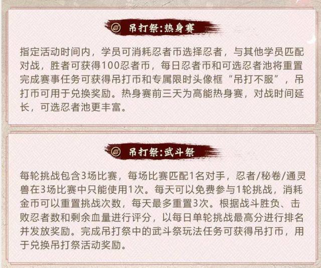 然后本周还会开启一个名叫“吊打祭”的活动,第一个是热身赛,第二个是武斗祭,虽然第一个活动看起来像是一个新活动,但看规则其实就是融合了之前一些无差别对战的玩法,并且也跟之前的赏金赛有点类似,加入了选择忍者消耗忍者币的设定,胜利也会拿到100忍者币。只不过这次的热身赛只是第一个阶段,后面还有海选、淘汰和决赛,第一轮的热身赛是1V1,后面还会有3V3,并且也有相应的忍者池。