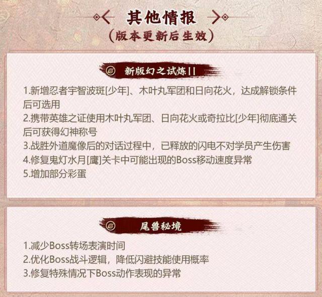 最后就是幻之试炼的一些改动,其中加入了之前帕克预告的少年时期宇智波斑,并且也新增了木叶丸和日向花火通关幻之试炼可以拿到幻神称号的设定。因为在这次的幻之试炼上线以后,一直有玩家认为少年奇拉比要比之前的自闭花火和木叶丸更难,这次的更新设定也算是满足了一些玩家的需求。其他的就是一些BUG修复和尾兽秘境的优化,本周没有任何忍者返场。