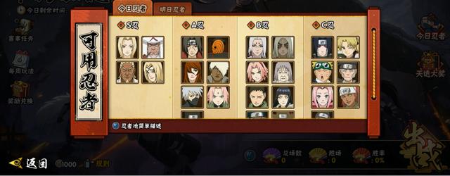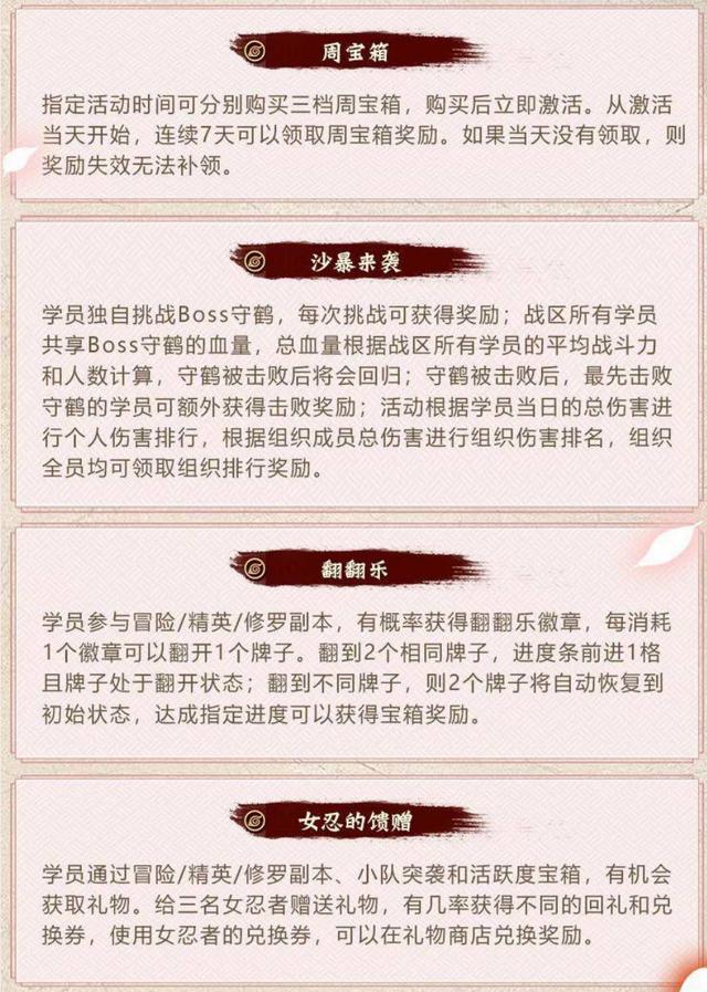 除了吊打祭活动以外,本周还有四个老活动返场,分别是周宝箱、沙暴来袭、翻翻乐以及女忍的馈赠。这四个活动没有什么特别需要注意的地方,沙暴来袭如果还是按照之前的玩法,鬼鲛应该是比较推荐的忍者,而翻翻乐就纯粹是考验记忆力的,实在记不住就用笔写下来就行了。