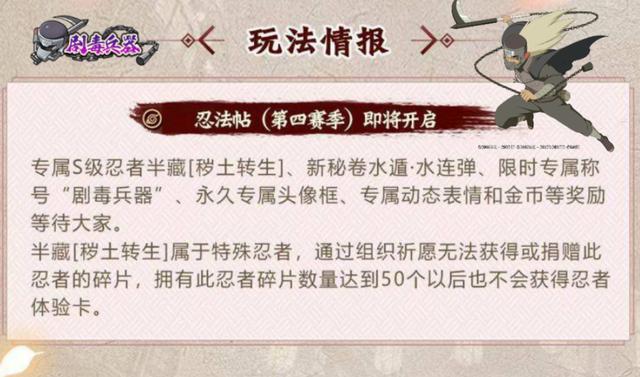 以上就是本周木叶快报的重点内容,很多玩家看到秽土半藏的技能演示后第一印象都不错,现在就看这个忍者的实战效果如何了,希望也会带来惊喜吧,毕竟前面三个赛季的忍法帖S忍都各有优势。对了,现在还有一点比较好奇,那就是制作秽土半藏的策划是谁?