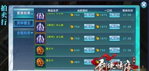 拍卖行分为家族拍卖和全服拍卖。家族拍卖一天共有四场,两场武林盟主和两场历代名将的拍卖。武林盟主基本上每个家族或多或少都有奖励,而历代名将,对于小家族来说,几乎没有意义,因为大家都知道,历代名将几乎是由几个大家族垄断的。全服拍卖,是在家族拍卖流拍后才会有的,不管是武林盟主的流拍,还是历代名将的流拍。