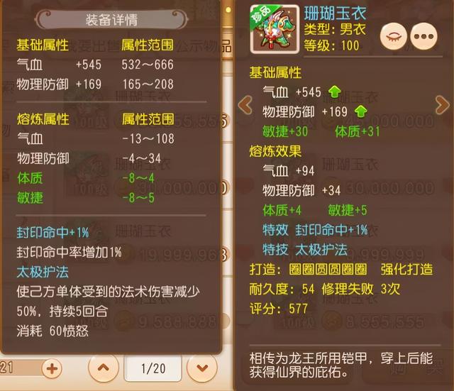 众所周知,敏体双加是最为适合辅助门派的属性之一。这件珊瑚玉衣的绿字属性与物理防御均已熔炼到满值,仅有气血值还剩14点到达上限。