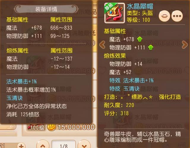 这件水晶犀帽就是一件带有玉清诀特技的极品头盔!说它是极品,当然不仅仅是因为它带有玉清诀,还因为它有法术暴击+1%的极品特效。无论是对法系输出门派还是以治疗为本的辅助门派,法术暴击+1%的特效都极为好用!