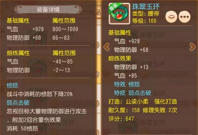 这根珠翠玉环就是一件带有愤怒特效的顶级神装!初始气血就接近满值,无论是物理防御还是气血均已熔炼到上限。除此之外,它还带有物理系神技之一的弱点击破!
