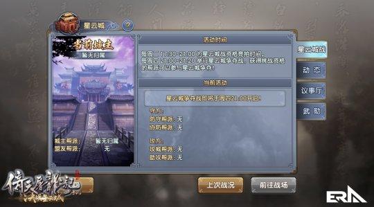 在游戏中莲宗教和苍云会地图,分别新增了一个星云城的传送点,星云城内在非城战期间属于安全区,侠士们可以在城内购买自身需要的特殊材料,而在城战期间无论城内城外皆属于战斗区域。