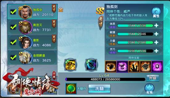 伙伴选择必须双力量 天然被动高加成攻击 一敏捷 护盾高加成 一爆发 独孤剑+纳兰(金翅大鹏 祝子虚三选一)+南宫灭(高长恭 杨影枫 或者也可以选韩世忠 四选一)+哲别(唐影 燕若雪 荆轲四选一) 有输出有爆发 有肉