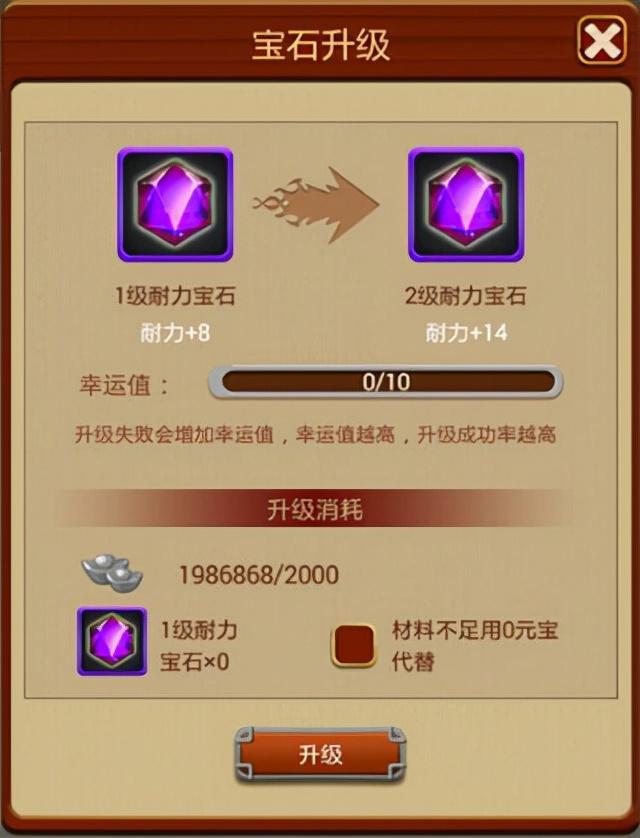 宝石共有15个等级。1级升2级需要不需要宝石,只花费银两。从升3级开始就需要消耗同类的一级宝石。等级越高消耗的就越多。另外值得一说的是,宝石升级还是看RP的~~小编我的人品就特别的差!!!只有一只刷,把幸运值刷满后才能升级~~悲催