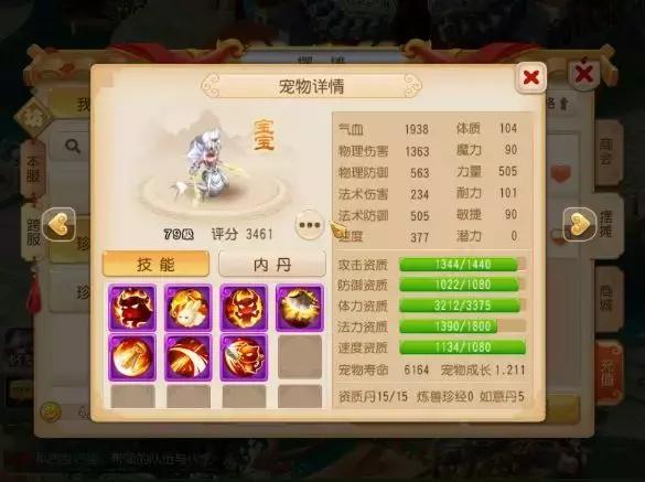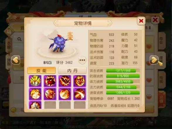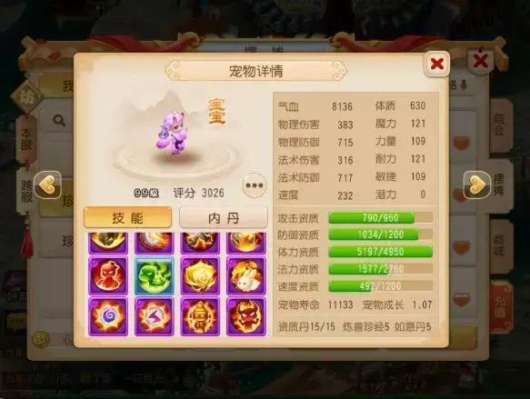 不得不说的是,银白色的鲛将军非常的帅气,它的速度资质已经爆满了,而攻击、防御和体力资质也都很不错,成长1.211。7技能全红,技能有高级强力、高级偷袭、高级突进、高级必杀,再搭配上力劈华山,是一只难得一见的极品宠物了。