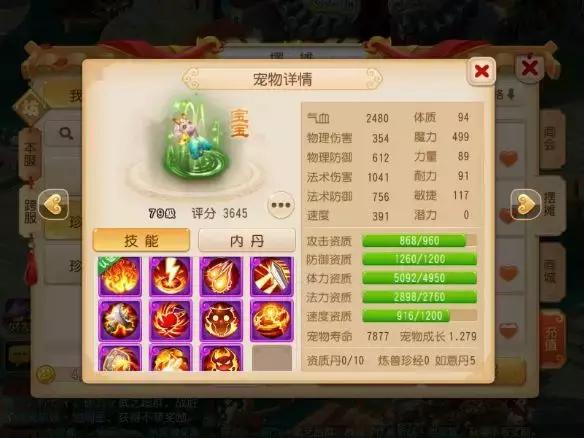 这是一只11技能的忘川童子,在没有吃过资质丹的情况下,防御、体力和法力资质都是爆满!而且成长也很不错,1.279。从技能上看,高级招架、高级反击以及高级神佑复生和高级强壮都增加了它一定的生存能力,灵儿觉得可以用“完美”二字来形容它。