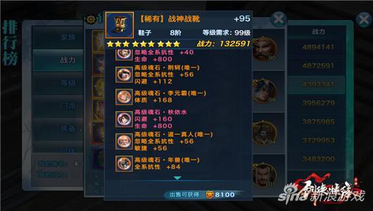 鞋子可以洗练力量、体质、会心免伤、敏捷、抗会心几率、回复效率等属性。鞋子可以镶嵌荆轲、年兽、道一真人、李元霸、纳兰潜凛等魂石,能大幅提升鞋子的综合战力。