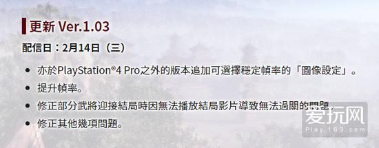 本次1.03版更新主要针对先前版本在一般PS4主机,特别是现行贩售的Slim PS4主机运行时流畅度不足的问题进行了改善;更新后将改善整体的流畅度,同时新增一般PS4也可选择的帧率稳定优先图像设定。此外,还修正了部分武将结局无法过关的问题与几项未公布细节的问题。